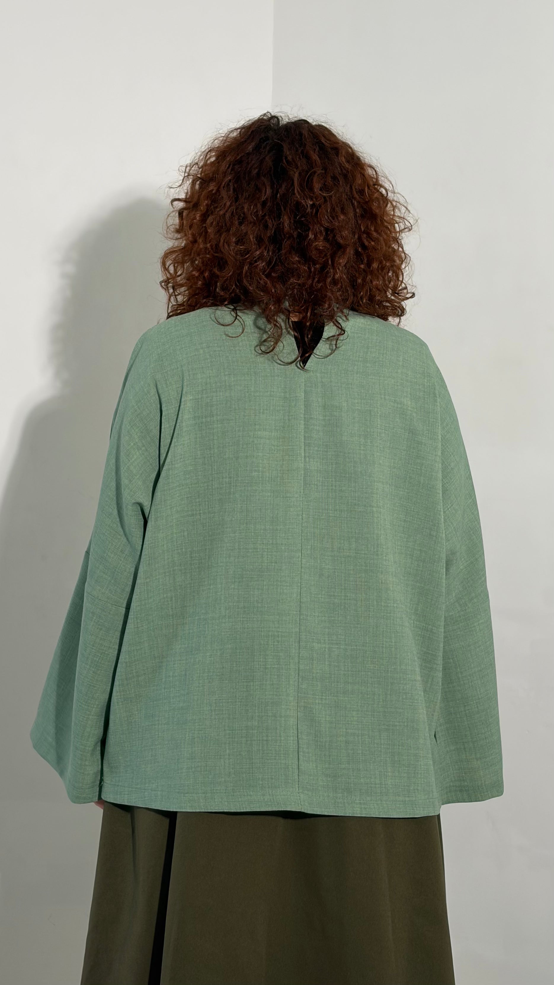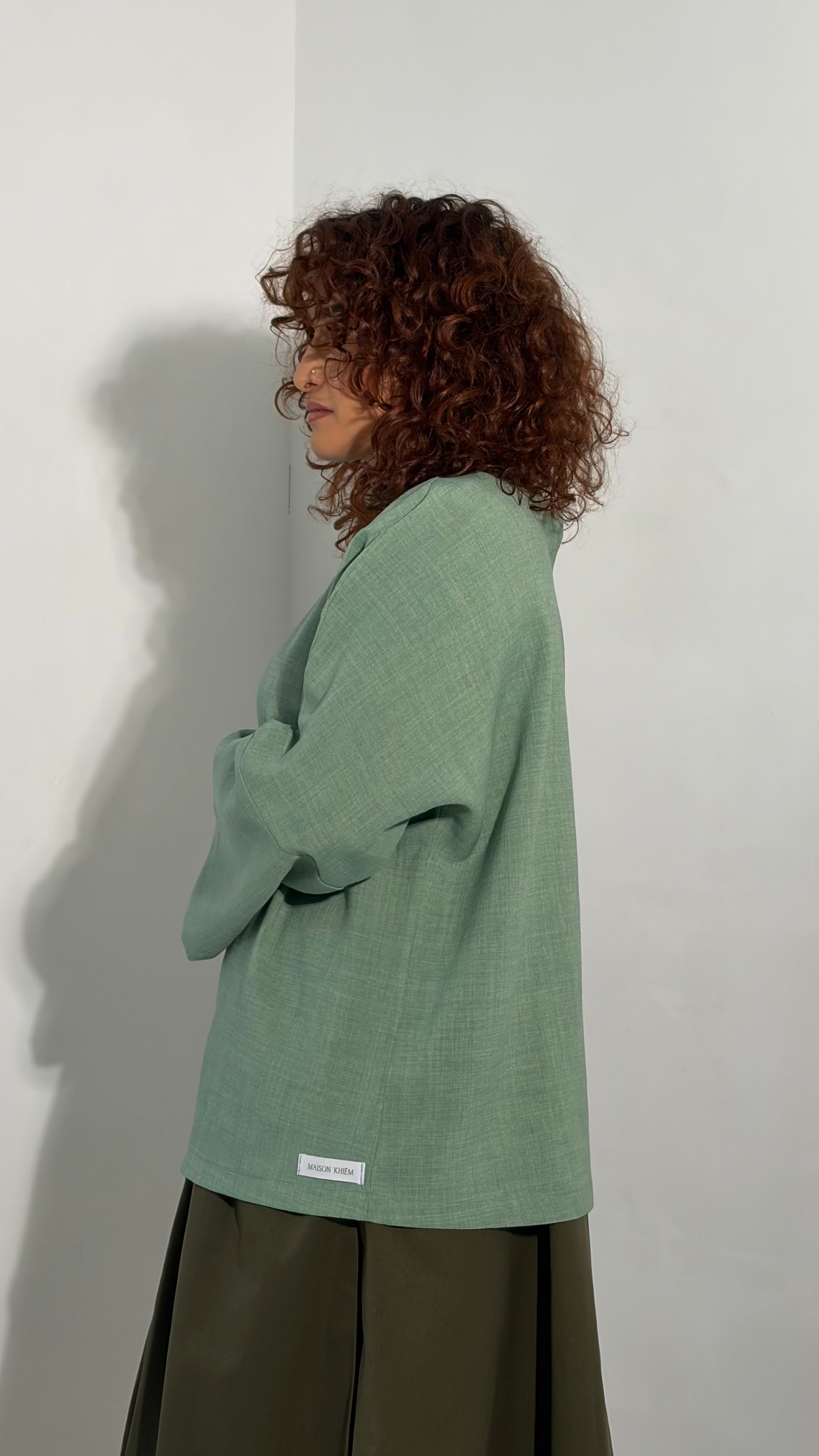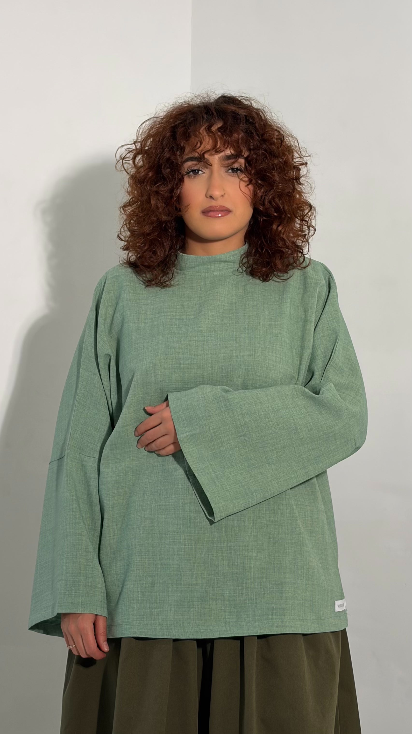 Le t-shirt effet lin se distingue par son col montant et sa coupe oversize.